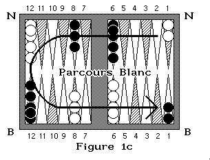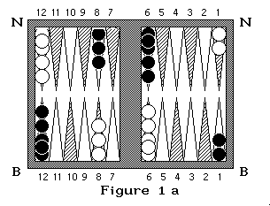 Le Backgammon est un jeu de course où il faut sortir ses pions avant l'adversaire. Chaque joueur possède 15 pions ou "dames". Les mouvements des pions sont régis par deux dés. La position initiale est représentée par la figure 1a. Les flèches du tablier (Board) matérialisent les cases où peuvent se déplacer les pions. Le board est divisé en 4 jans.