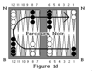 Les pions se déplacent de flèche en flèche en décrivant un fer à cheval autour du board. Les blancs parcourent le board dans le sens N1-N12-B12-B1 (figure 1c), alors que les noirs le parcourent en sens inverse : B1-B12-N12-N1 (figure 1d).![]()