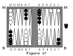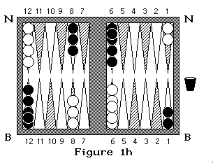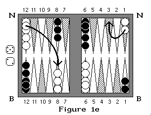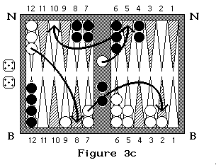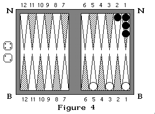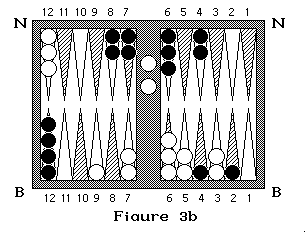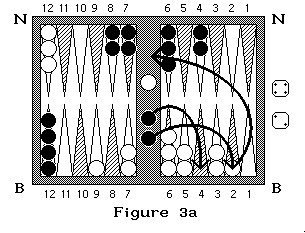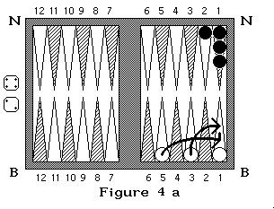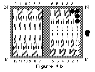 Sur la figure 3 Blanc à un pion pris et lance 5 et 3 : il doit rentrer son pion soit avec le dé 3 en arrivant en N3 soit avec le 5 en arrivant en N5 (on commence à compter en N1). Si dans cette même position, noir qui à deux pions pris lance 4 et 2 il doit sortir ses pions en B4 et B2 en prenant un pion blanc (figure 3a et 3b). S'il lance 3 et 4, il sort un pion en B4, mais il ne peut sortir le second en B3 car la case est occupée par deux pions adverses, il doit donc passer après avoir rentré son premier pion. Si noir lance 6 et 6 il ne peut rentrer aucun de ses pions donc il passe.