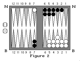 Il faut noter que le mouvement montré n'est pas le meilleur, en effet si noir, à qui c'est le tour de jouer, jette 4-4, il va pouvoir jouer:(0-B4)x2 B4xB8 B12-N9. Blanc a un pion à la barre et trois autres en prise directe (B7, B9 et N10).