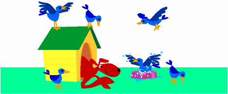 Le petit oiseau vait l'habitude prendre son bain dans l'ecuelle du chien. Il mettait de l'au partout, le chien lui dis,...